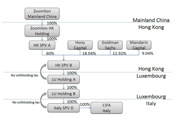 HK中有3個投資方進(jìn)入,Zoomlion HK Holding和 HK SPV B的存在確保了不管投資方如何變動,香港往上到中國和香港向下到盧瑟堡的結(jié)構(gòu)不會受影響。