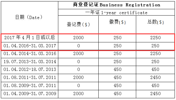 商業(yè)登記證歷年價格調(diào)整情況